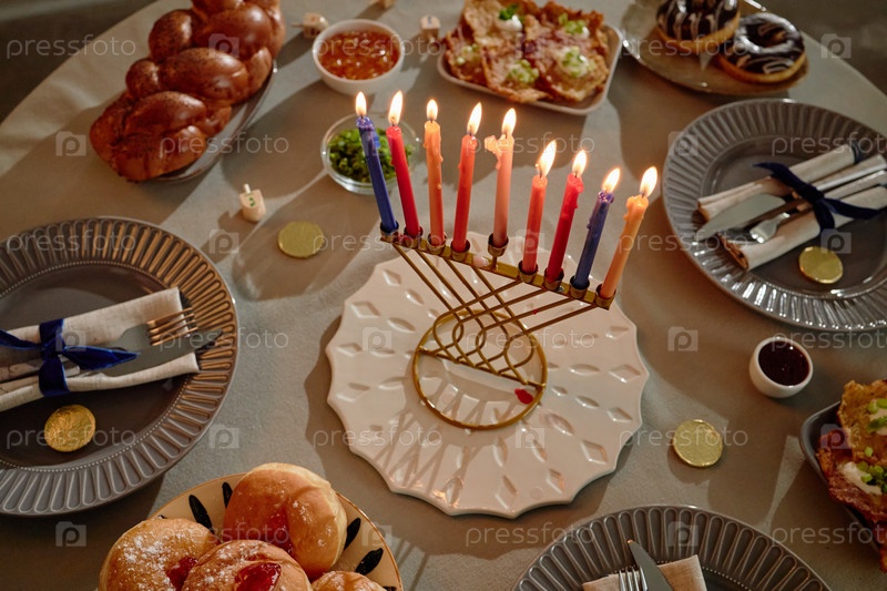 Свечи Хануки Менора горят в окружении традиционной праздничной еды
