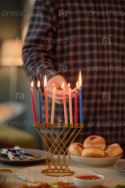 Зажигание свечей меноры Человек, празднующий Хануку