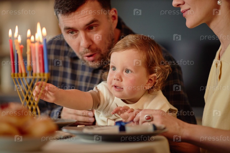 Мужчина и женщина смотрят на ребенка, который зажигает свечи Ханукки