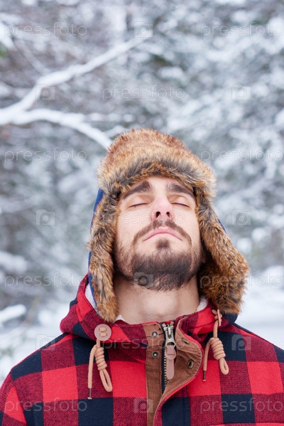 Молодой взрослый мужчина отдыхает на свежем воздухе в снежном зимнем лесу