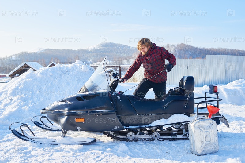 Молодой человек запускает снегоход на открытом воздухе в зимний день