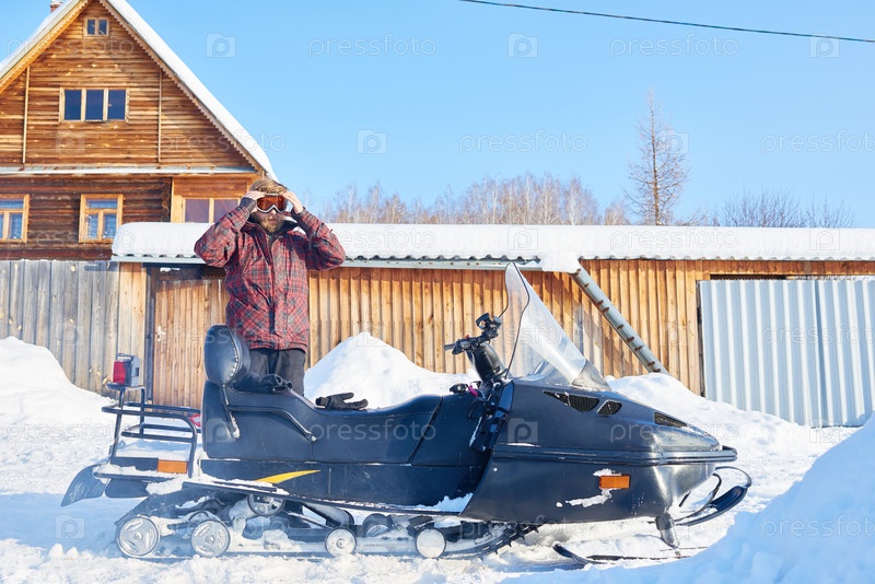 Мужчина средних лет регулирует очки, стоя рядом со снегоходом