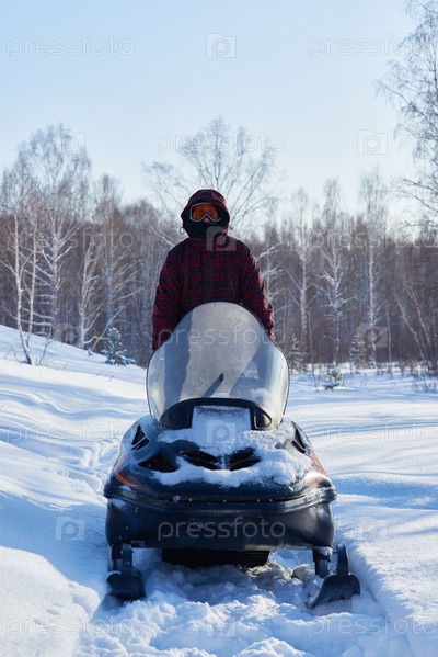 Молодой взрослый мужчина едет на снегоходе по ландшафту зимних лесов