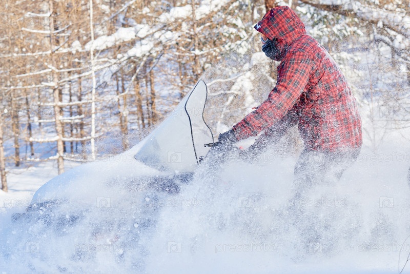 Езда на снегоходе через глубокий снег в зимнем лесу
