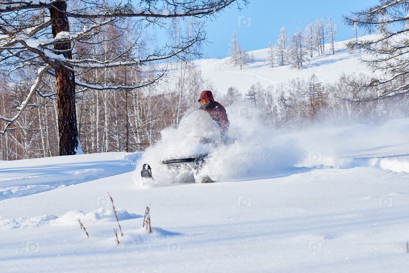 Взрослый мужчина едет на снегоходе через глубокий снег в ландшафте зимнего леса