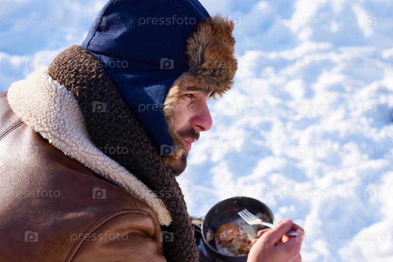 Мужчина средних лет ест горячую пищу на улице во время зимнего снегопада