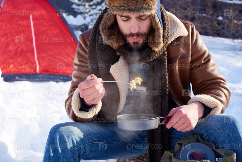 Молодой взрослый мужчина ест горячую пищу на свежем воздухе во время зимнего кемпинга