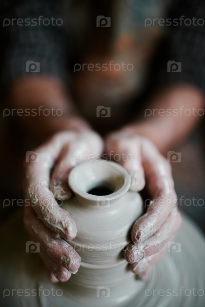 Человек среднего возраста формирует глиняную керамику на прядящемся колесе
