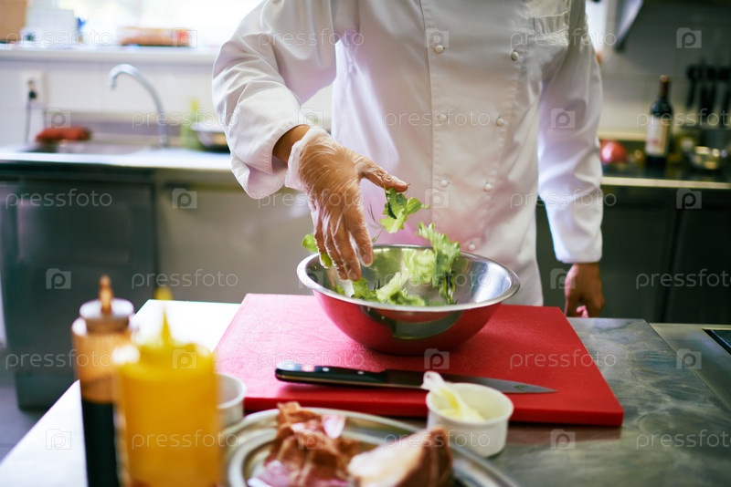 Молодой взрослый мужчина готовит салат на профессиональной кухне
