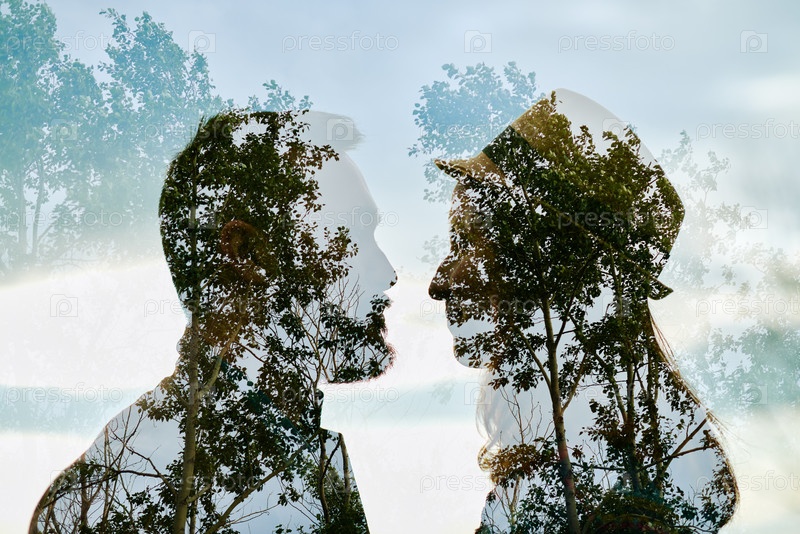 Молодой взрослый мужчина и женщина, стоящие друг против друга в двойной экспозиции