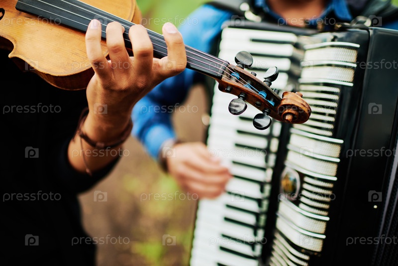 Молодая взрослая женщина играет на скрипке рядом с молодым мужчиной, который играет на аккордеоне