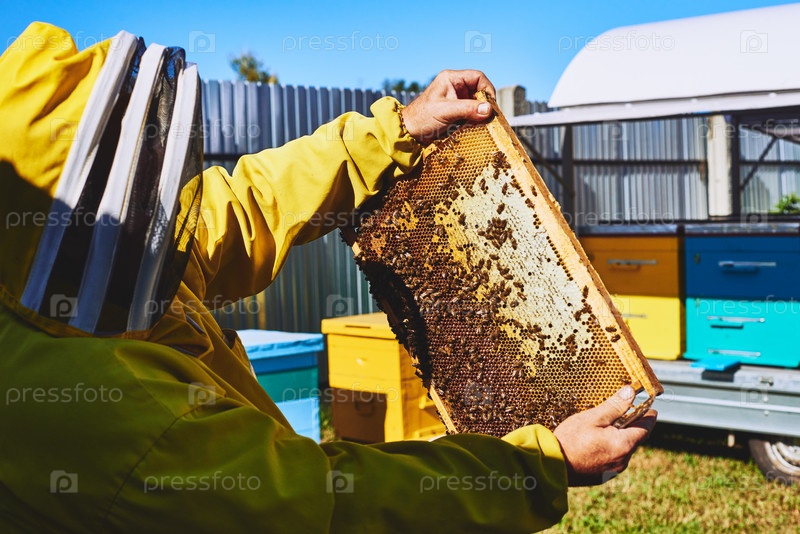 Мужчина среднего возраста осматривает рамку улья на открытом огороде