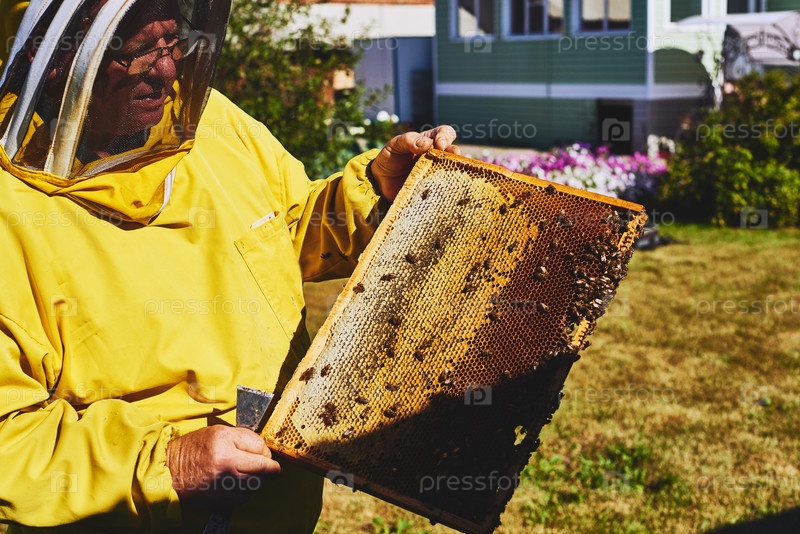 Старший человек инспекция пчелиный улей рамы во время пчеловодства на свежем воздухе