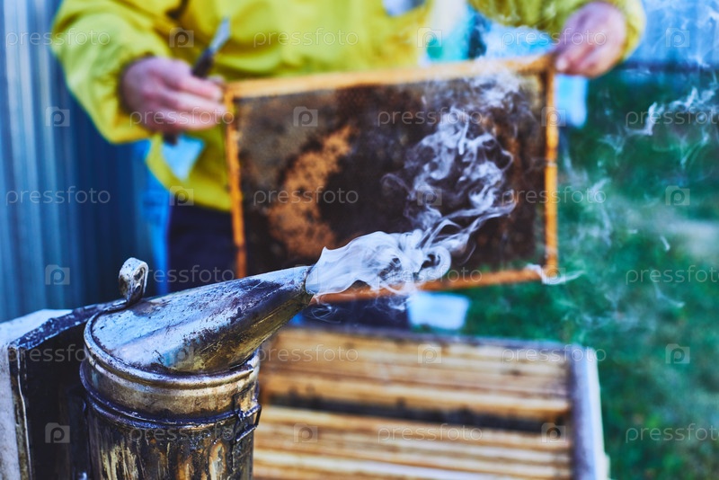 Человек, обращающийся с рамкой улья пчел при использовании курильщика на открытом воздухе