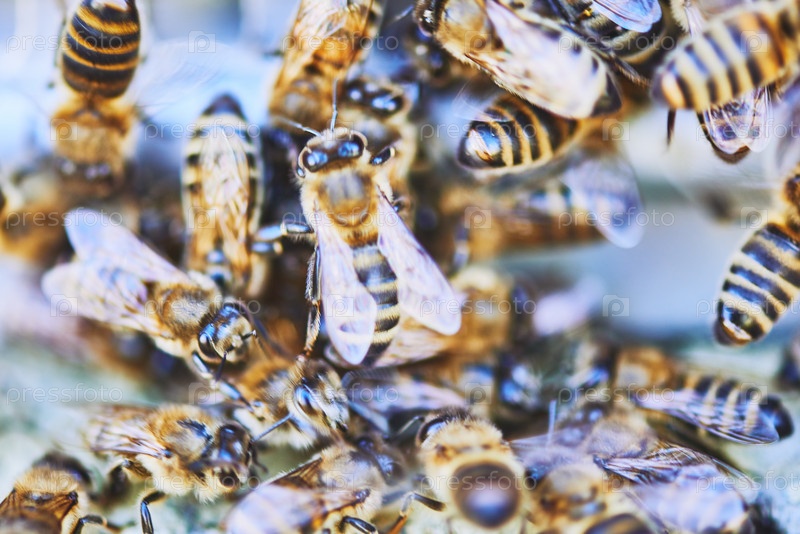 Группа медоносных пчел, в стае и собирающихся на улье в естественной среде