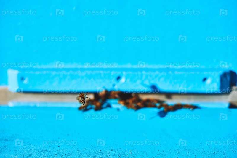 Медоносные пчелы летают возле входа улья на ярко-синем окрашенном фоне