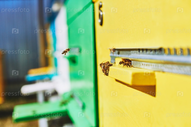 Медоносные пчелы летают вокруг красочных деревянных ульев на улице под солнечным светом