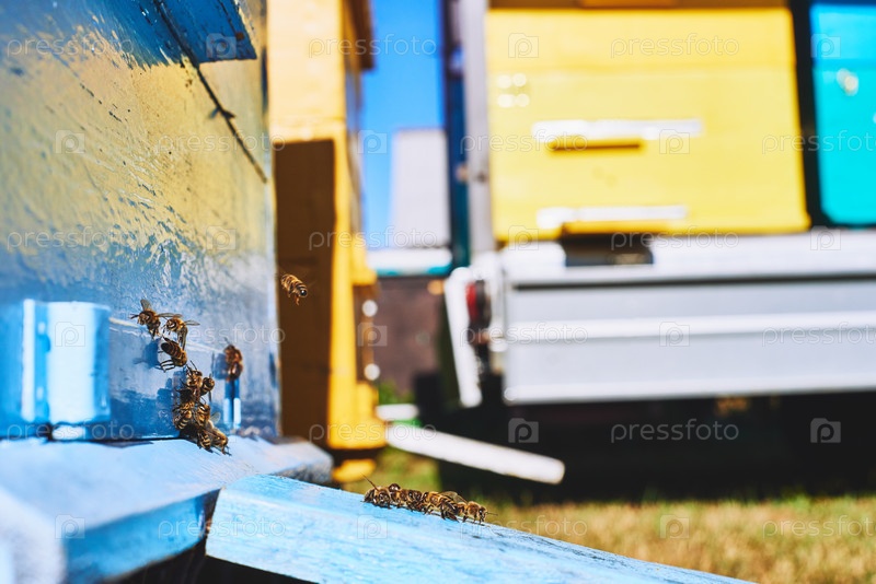 Медовые пчелы собираются вокруг красочных деревянных ульев на открытом воздухе летом