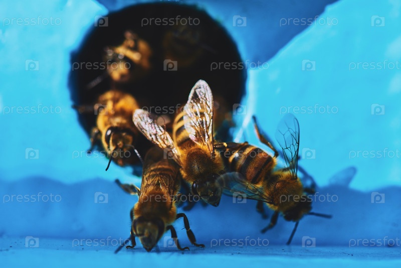 Группа медоносных пчел, входящих и выходящих из голубого улья днем