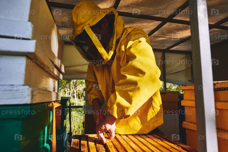 Молодой человек собирает сосуды в защитном костюме для пчеловодства