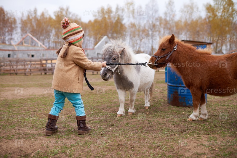 Девочка кормит пони на открытом воздухе во время осеннего дня на ферме