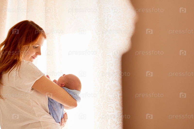 Молодая взрослая женщина держит новорожденного ребенка возле солнечного окна