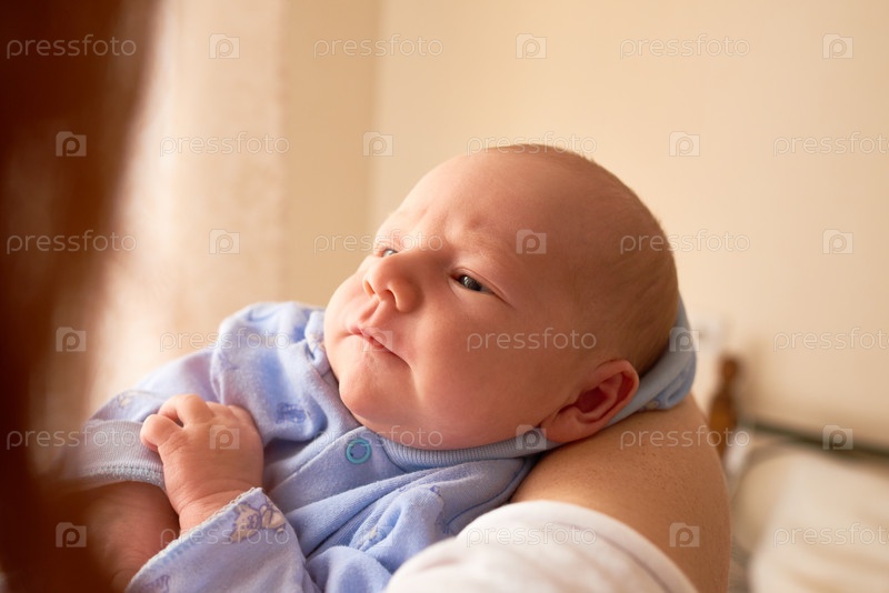 Новорожденный ребенок лежит в руках взрослого и смотрит внутрь