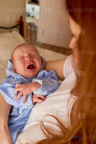 Женщина, утешающая плачущего новорожденного ребенка в помещении дома