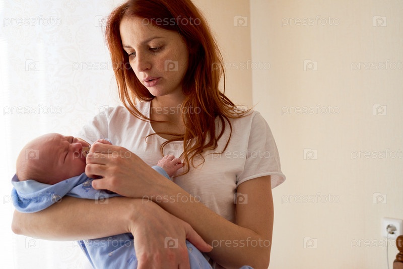 Молодая женщина утешает новорожденного ребенка, стоя в помещении