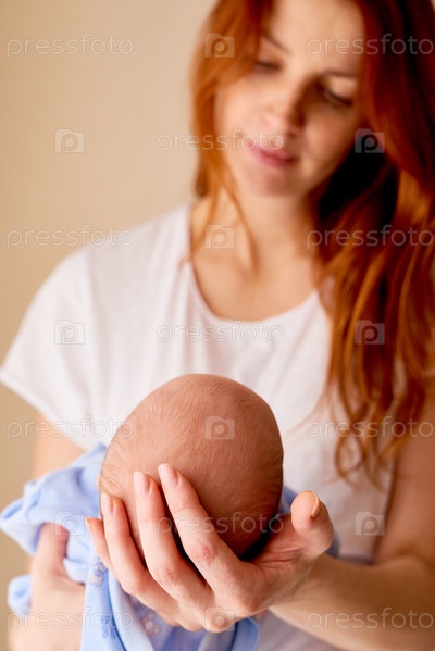 Молодая взрослая женщина держит новорожденного ребенка в руках внутри