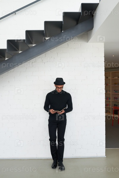 Молодой взрослый мужчина стоит под лестницей, читает книгу в помещении