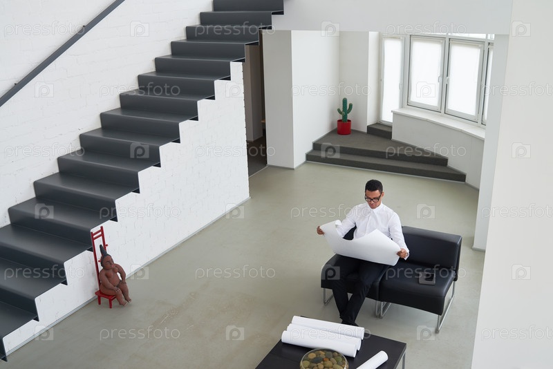 Молодой взрослый мужчина сидит на диване, изучая большие архитектурные планы