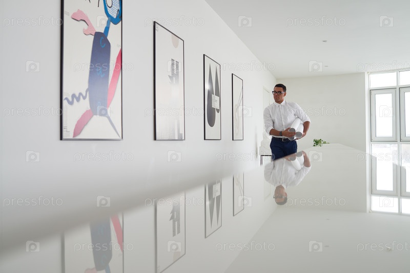 Молодой взрослый мужчина ходит вдоль современного офисного коридора, отражая искусство