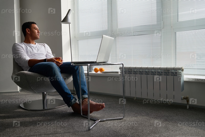 Молодой взрослый мужчина сидит у окна, используя ноутбук и любя милосердие