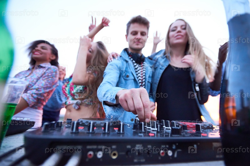 Группа молодых взрослых мультиэтнических друзей, танцующих и DJ смешивающих музыку на открытом воздухе
