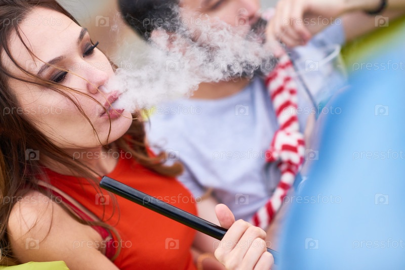 Молодая женщина курит кальян с молодым человеком, общаясь на свежем воздухе