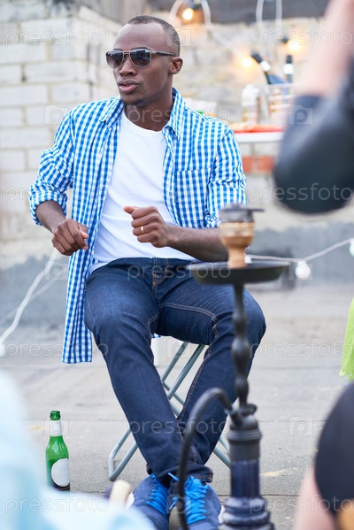 Молодой взрослый чернокожий мужчина отдыхает на открытом воздухе, курит кальян на крыше собрания