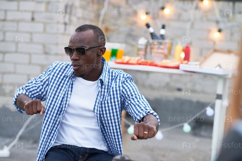 Молодой взрослый чернокожий мужчина танцует на свежем воздухе во время мероприятия Rooftop Summer Party