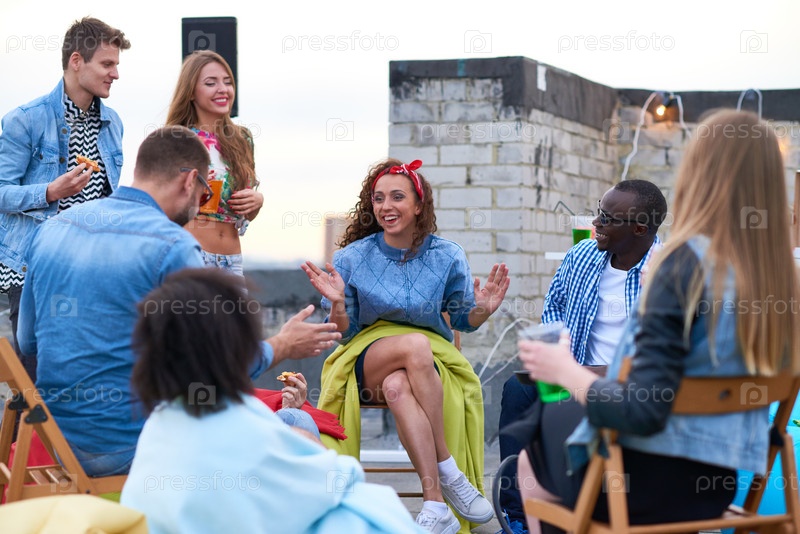 Разнообразная группа молодых взрослых, общаясь и смеясь на крыше