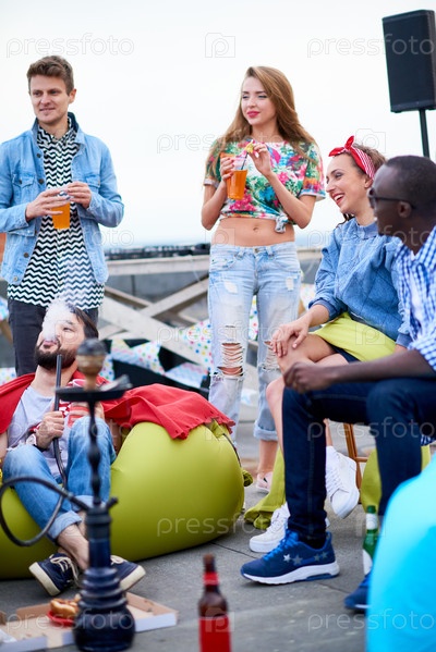 Группа молодых мультиэтнических друзей, общающихся и пьющих на свежем воздухе