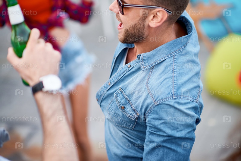 Молодой взрослый мужчина смеется на улице во время общественного собрания