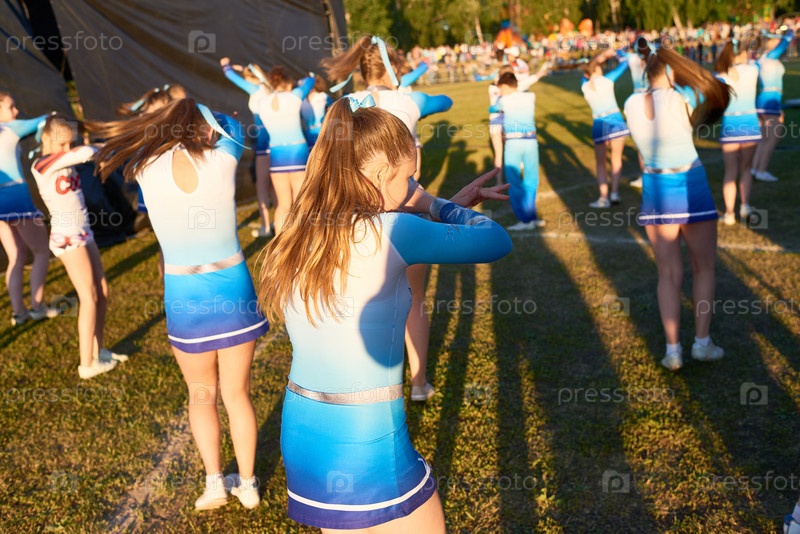 Девочки, выполняющие рутинную работу чирлидеров на свежем воздухе в зале Sunset