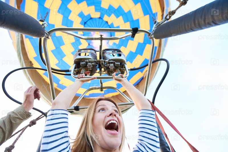 Молодая женщина улыбается во время езды на воздушном шаре