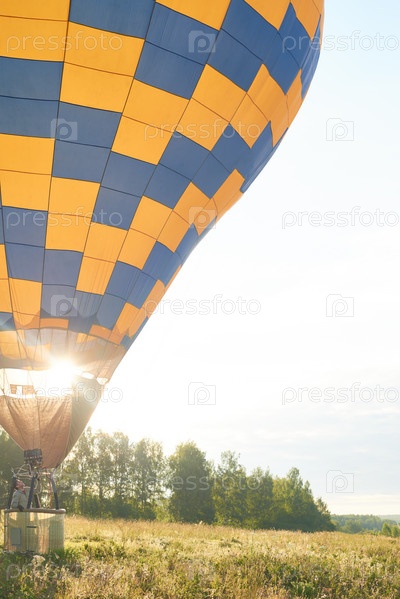 Балон горячего воздуха готовится к взлету над лугом во время солнечного утра