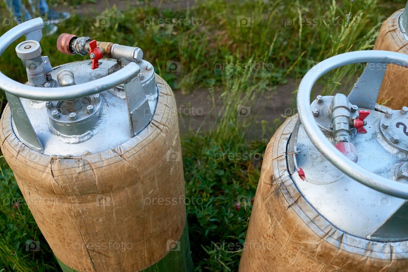 Цилиндры с промышленным газом, стоящие на открытом воздухе на траве возле дороги