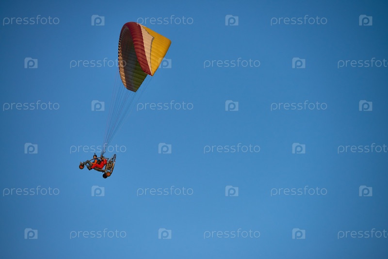 Молодой взрослый мужчина парапладирует с моторизованным парашютом против чистого голубого неба