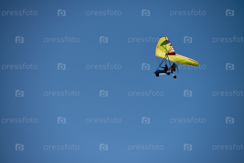 Молодой взрослый человек пилотирует ультралегкий самолет против голубого неба