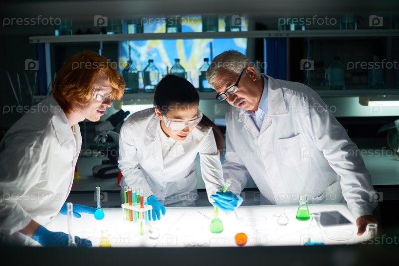 Микробиологи в защитных очках и резиновых перчатках изучают жидкий образец