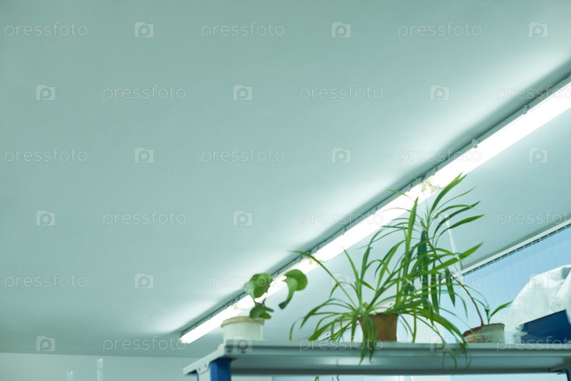 Горшки с комнатными растениями, стоящими на полке вблизи потолка