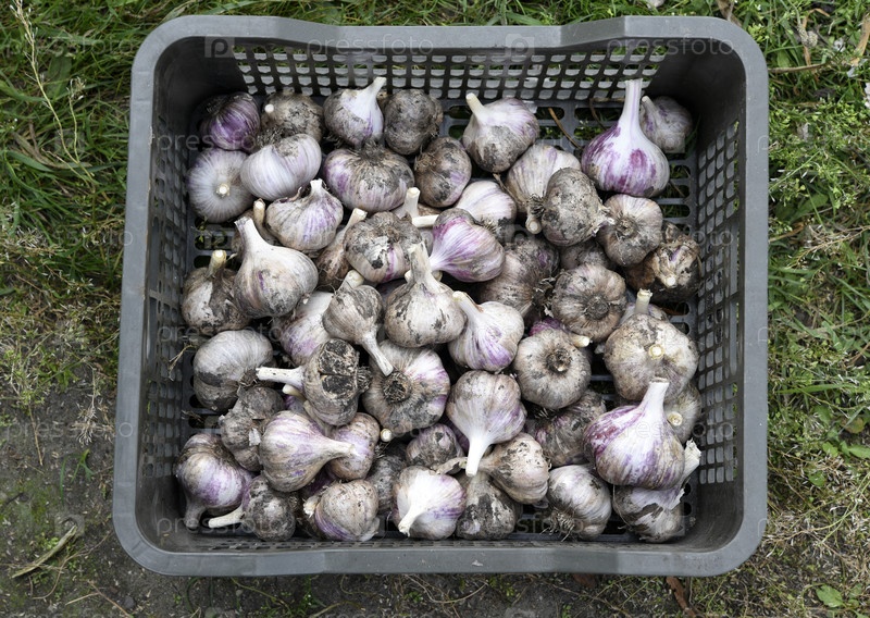 чеснок в пластиковой корзине. урожай чеснока осенью. седые луковицы
